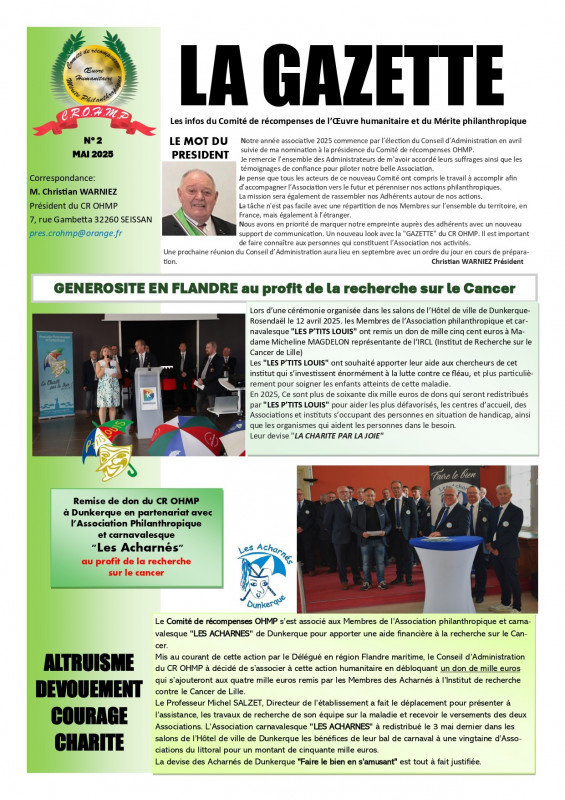 • Monsieur le Président, Cher ami, Je tiens à vous exprimer toute notre gratitude pour le don de 1000€ que votre association a consenti à l’Unass Solidarité, somme qui a été consacrée au c...