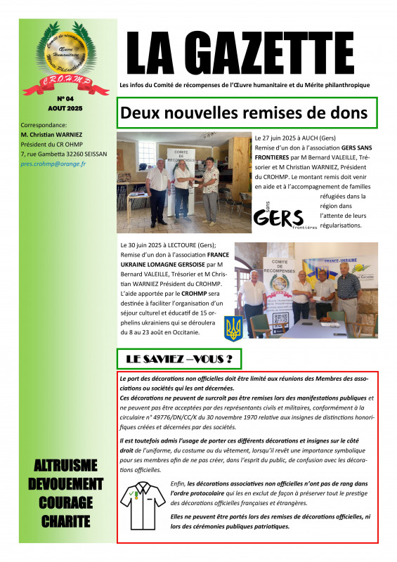 Monsieur le Président, Cher ami, Je tiens à vous exprimer toute notre gratitude pour le don de 1000€ que votre association a consenti à l’Unass Solidarité, somme qui a été consacrée au c...