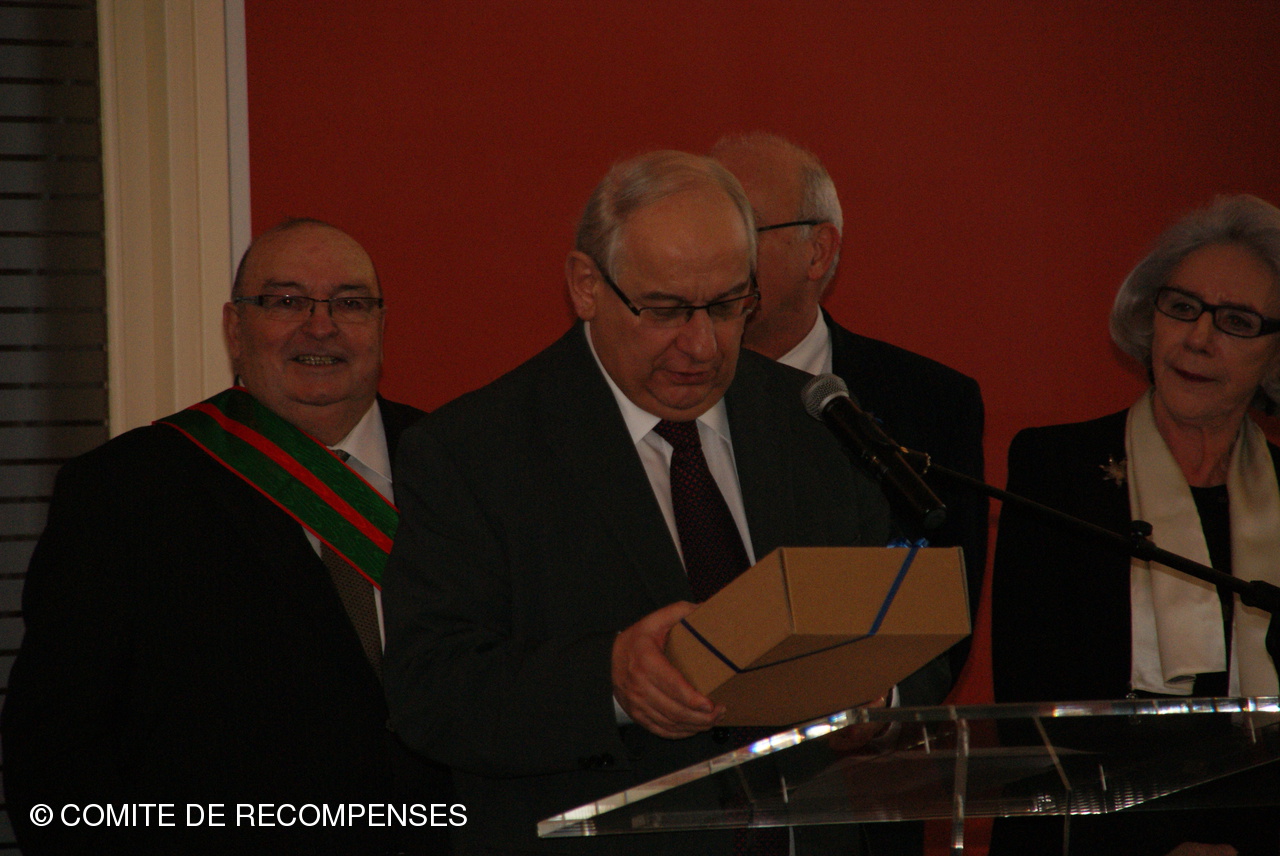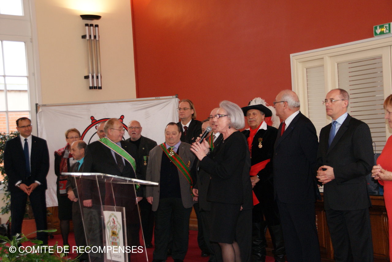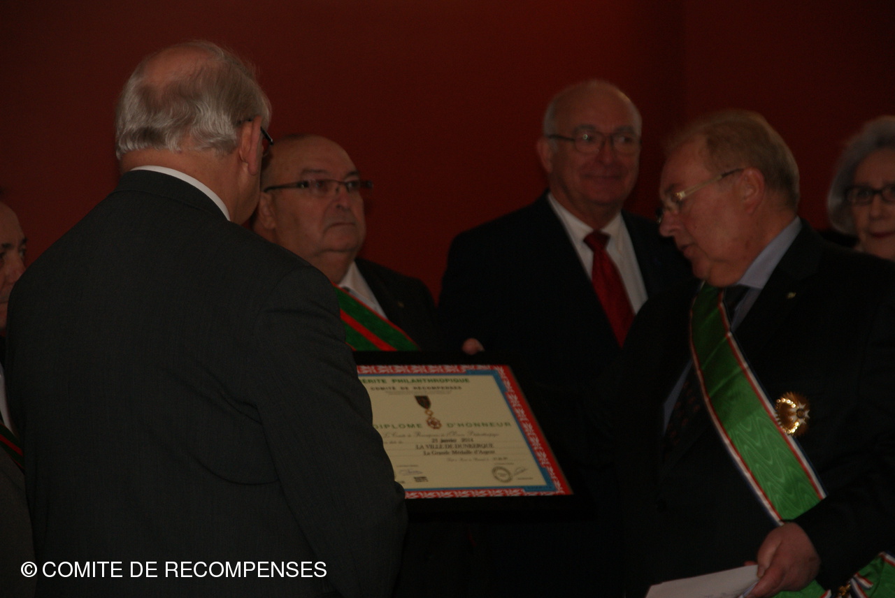 Remise par le Comité de Récompenses d'un Diplôme d'Honneur à la Ville de DUNKERQUE. Le Président J.M.LISSE accompagné de Mrs B. THOMAS,F. DERONNE, M. CLAUS, R. DEZITTER et C. DUMINY administrateurs et leurs épouses ont remis au Sénateur-Maire de DUNKERQUE le Diplôme d'Honneur du Comité.